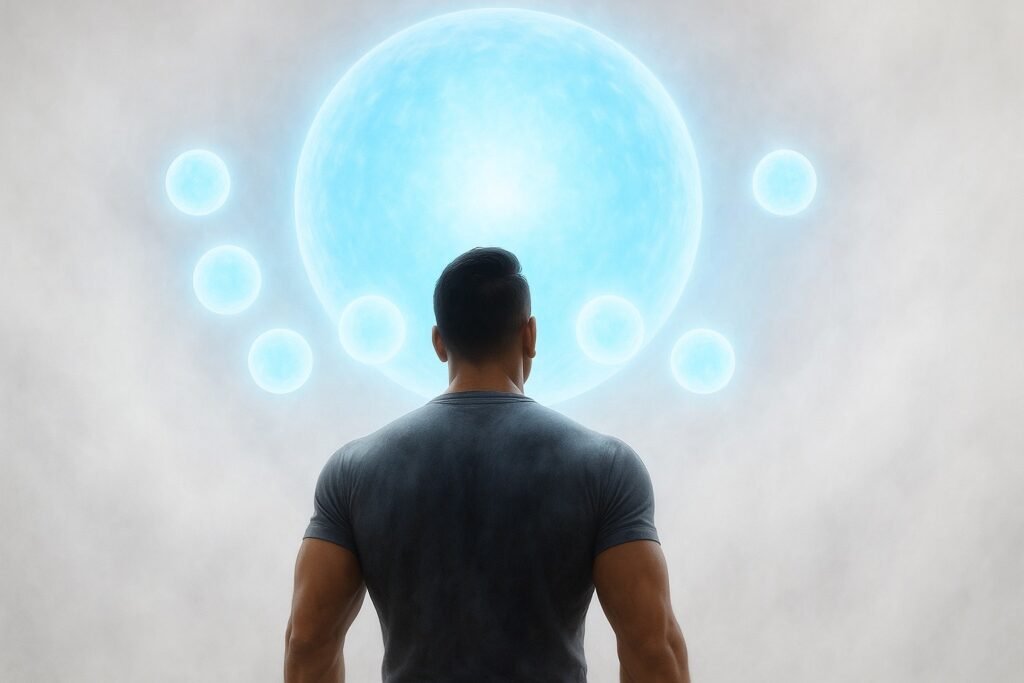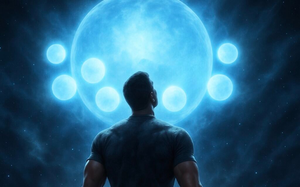 就像從夢中驚醒一般,我張開雙眼,視線由下往上飄移,赫然在極其遙遠的宇宙天際,看見一個龐大的能量光體,祂正注視著我。那種龐大,若要形容,就如世界末日時,月球即將撞上地球,人類從地表仰望月球時所感受到的那種壓迫般巨大。在祂身旁,還緊貼著七個雖較小,卻同樣龐大的能量光體。而整個四周空間,則被一層白色濃霧壟罩著。