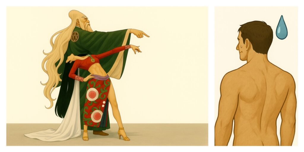 祂做出日本人常用來表示「原來如此」的手勢,右手握拳,輕敲在攤平成圓盤狀的左手掌上,發出了一聲「哦!」。接著,祂幻化成日本動漫《海賊王 ONE PIECE》中那位高傲不可一世的「蛇姬」 ─ 波雅・漢考克;同時也化身為我童年時最喜歡的另一部日本漫畫《封神演義》中,崑崙山的「仙人教主」 ─ 元始天尊。兩人還不約而同地把頭往後仰,整個人向後傾倒,腦袋像是要著地般,我的視線完全看不見他們的正臉,只見他們各自伸出單邊的手,狠狠地指向我。